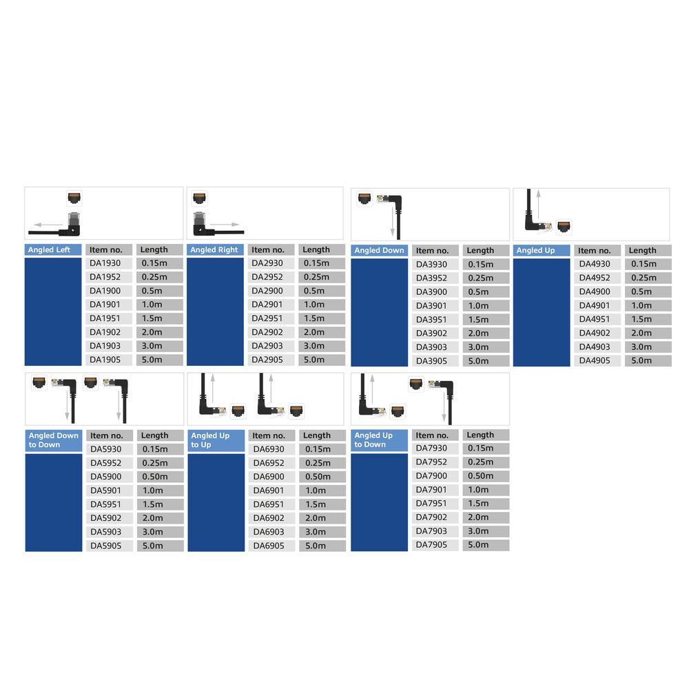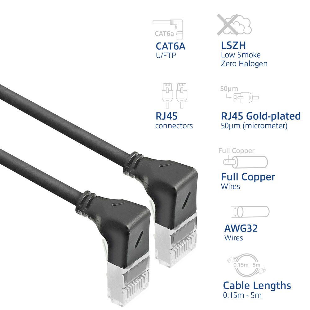 A patch kábel két 90°-os lefelé hajló RJ45 csatlakozóval rendelkezik. Ideális olyan helyekre, ahol korlátozott a hely, és nem lehet megnövelni a hajlítási sugarat. Például hálózati szekrényekben és berendezések mögött.