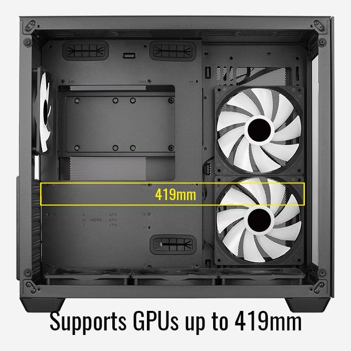 ATX, Black, 1x3,5", 2x2,5", 1xUSB2.0, 2xUSB3.0, Audio, Táp nélkül, 285x380x420mm, Ventilátor:4x12cm, 2x14cm, Tempered glass window, RGB, Gamer