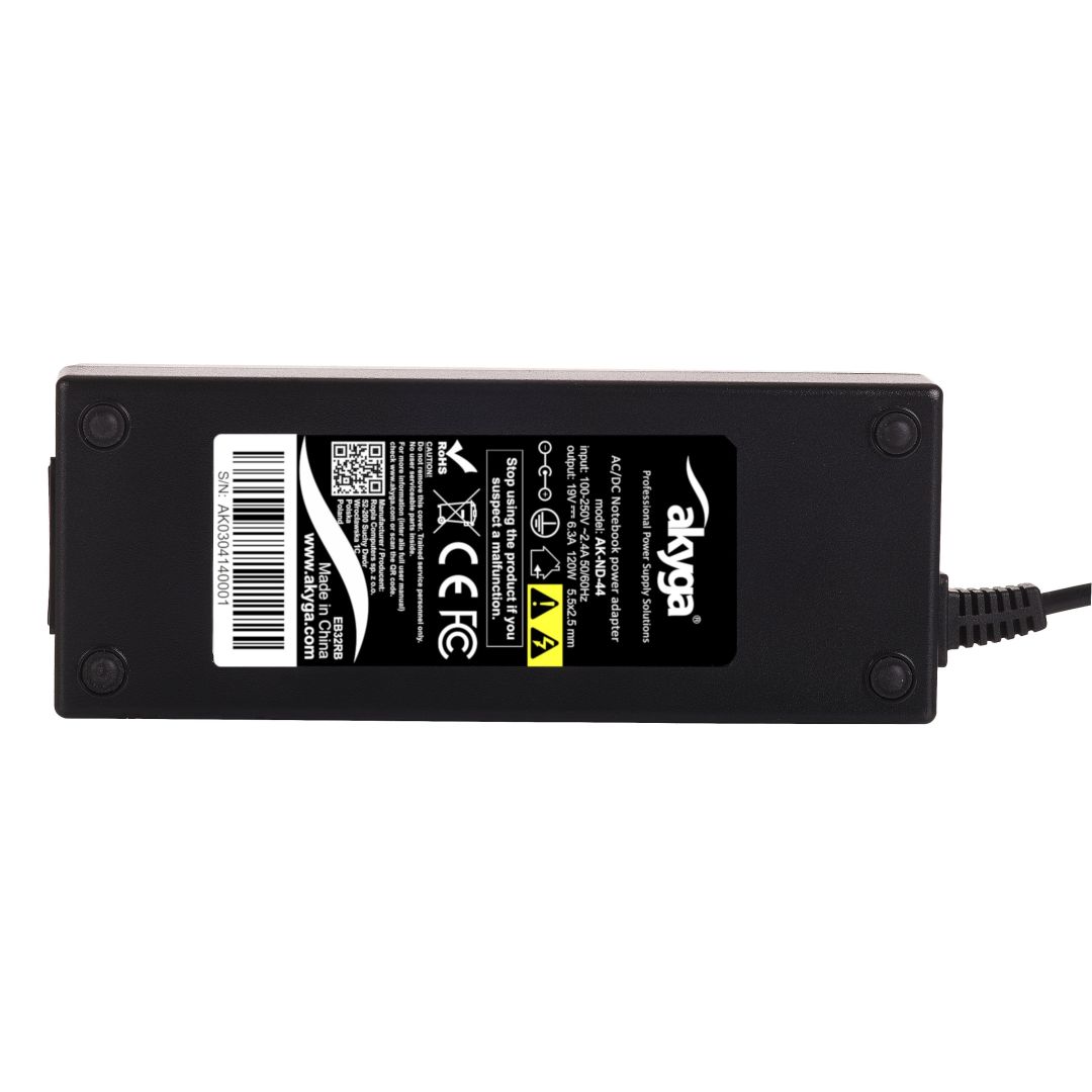 Akyga® AK-ND-44 tápegység 120W, amely kompatibilis az összes modell a laptopok Melyik feszültség 19V és 6.3A maximális áramlási és dugó 5.5 * 2.5 mm.