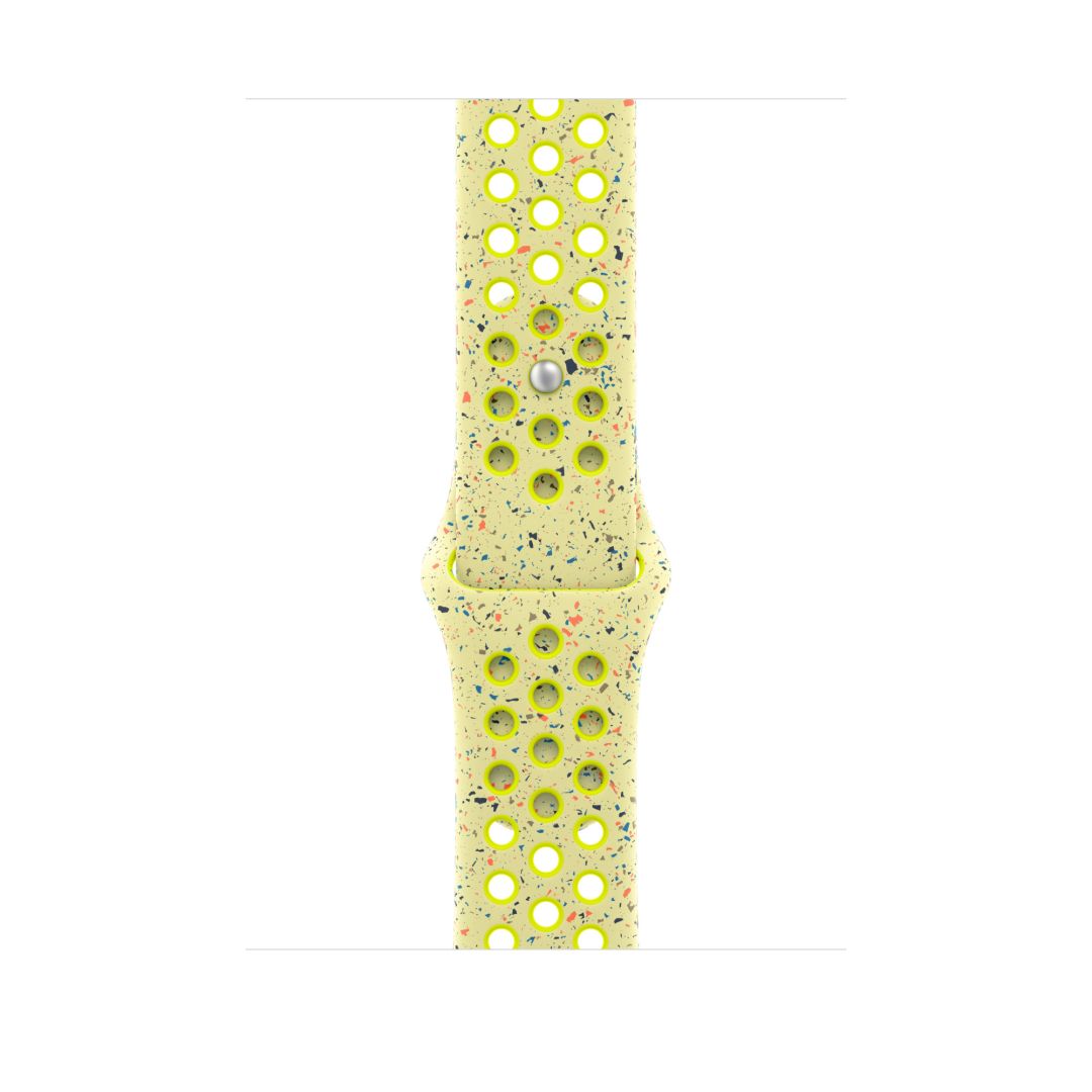 A jól szellőző, gépi sajtolással perforált Nike sportszíj tartós és erős, mégis meglepően puha. Színes szemcséi véletlenszerű mintázatot alkotnak, tökéletesen egyedivé téve minden szíjat. A kellemes tapintású anyag elegánsan mutat a csuklón, és finoman simul a bőrödre. Az alumíniumból készült bújtatós rögzítő tűje mutatós matt felületet kapott. A rögzítőbe a Nike Run Swoosh logóját gravírozták.