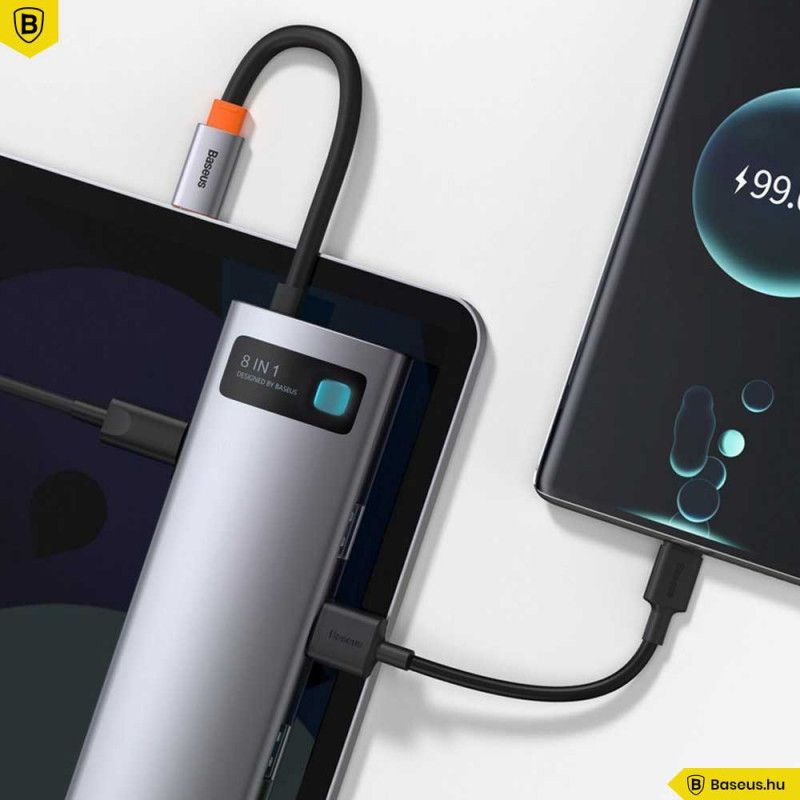 Az USB-C Power Delivery(PD) csatlakozónak köszönhetően feltöltheti eszközét, miközben az adapter csatlakoztatva van hozzá. Laptopja tartósan csatlakoztatható a tápegységhez, a telefon pedig töltheti az akkumulátort.