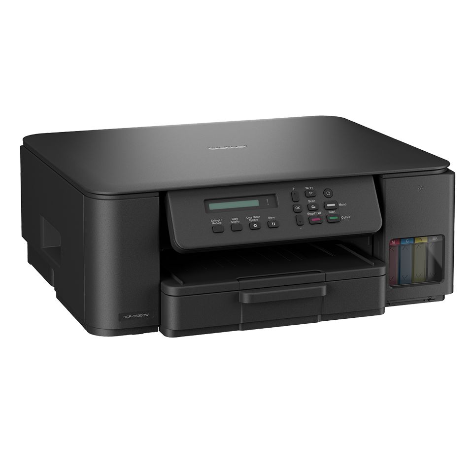 A kompakt DCP-T535DW tintatartályos 3 az 1-ben nyomtató hosszabb ideig nyomtat szuper nagy kapacitású tintapalackokkal. A tintatartályok feltöltése másodpercek alatt megtörténik, anélkül, hogy tartania kellene a palackokat. Töltse fel a megfelelő színt az innovatív palackrendszerrel. A tinta beöltése akkor indul el, ha a palack kattanó hanggal csatlakozik a tartályhoz.