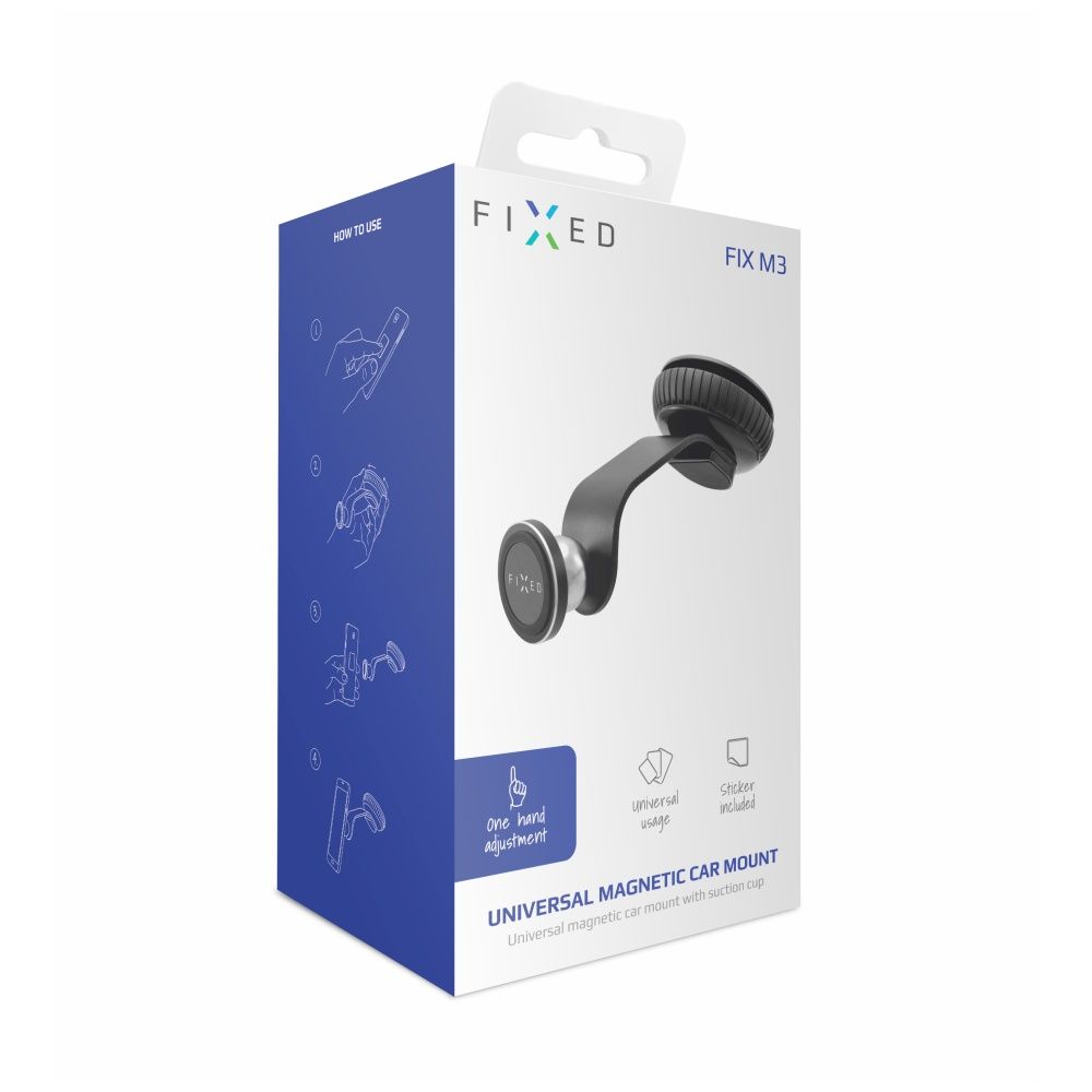A FIXED FIXM3 egy praktikus tartozék a mobiltelefon autóban való tartásához. A tartó alján található, erősen tapadó tapadókorong a szélvédőhöz való stabil rögzítést szolgálja. Stílusos megjelenésének köszönhetően tökéletesen kiegészíti minden jármű belsejét. A telefon mágneses rögzítését a tartóhoz egy fém öntapadós token biztosítja, amelyet csak a telefon hátuljára vagy borítójára kell ragasztania, vagy egy fémlemez, amely a telefon és a borító közé illeszthető. A telefon fogása szilárd és stabil, ellenáll minden vezetés okozta ütésnek. A tartó kerek zsanérja lehetővé teszi, hogy a telefont bármilyen szögbe állítsa.