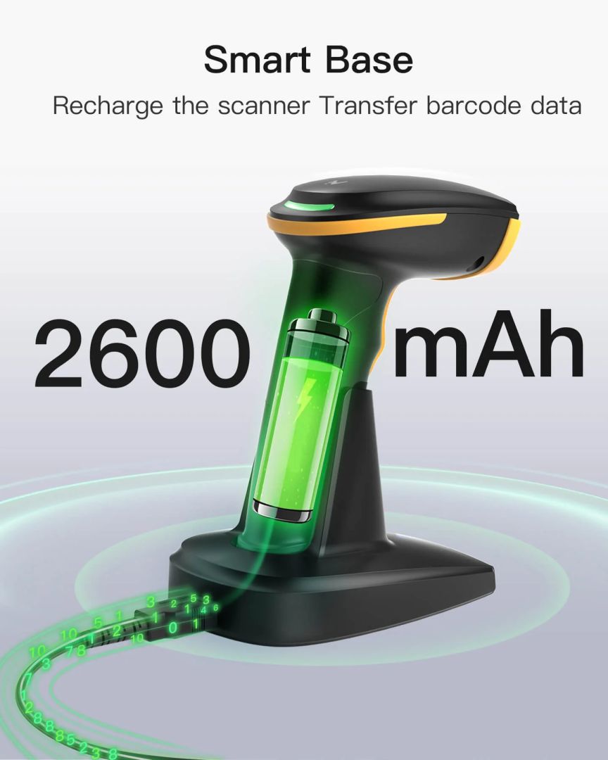 Nagy akkumulátor-kapacitás + intelligens töltőállvány: A vonalkód-leolvasó 2600 mAh-s akkumulátorral és az Inateck legfejlettebb akkumulátor-algoritmusával rendelkezik, amely alacsonyabb energiafogyasztást és hosszabb akkumulátor-élettartamot biztosít. Az intelligens töltőállvány lehetővé teszi a számítógéphez való egyszerű csatlakozást a mellékelt USB-kábelen keresztül, így mind a töltés, mind a vonalkód-adatátvitel lehetséges – többé nem kell aggódnia az akkumulátor élettartama miatt