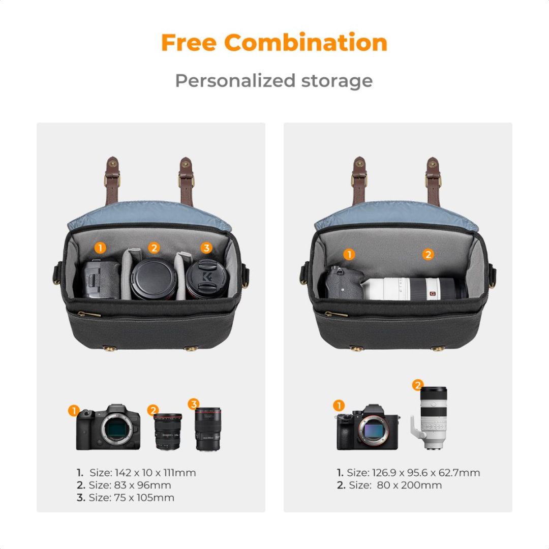 【Customizable Space 】Ez a crossbody fényképezőgép táska két kivehető párnázott elválasztóval rendelkezik, hogy a különböző kamerákat, vakukat, objektíveket és egyéb fényképezőgép felszereléseket elkülönítve és védve tartsa, a belső teret az igényeik alapján beállíthatja.