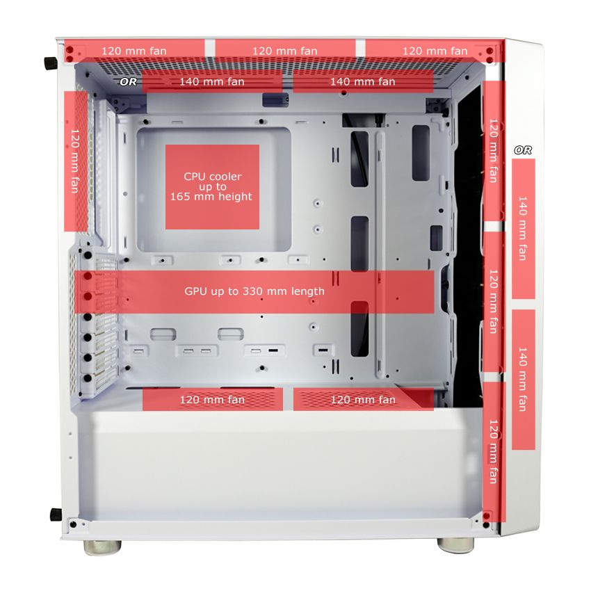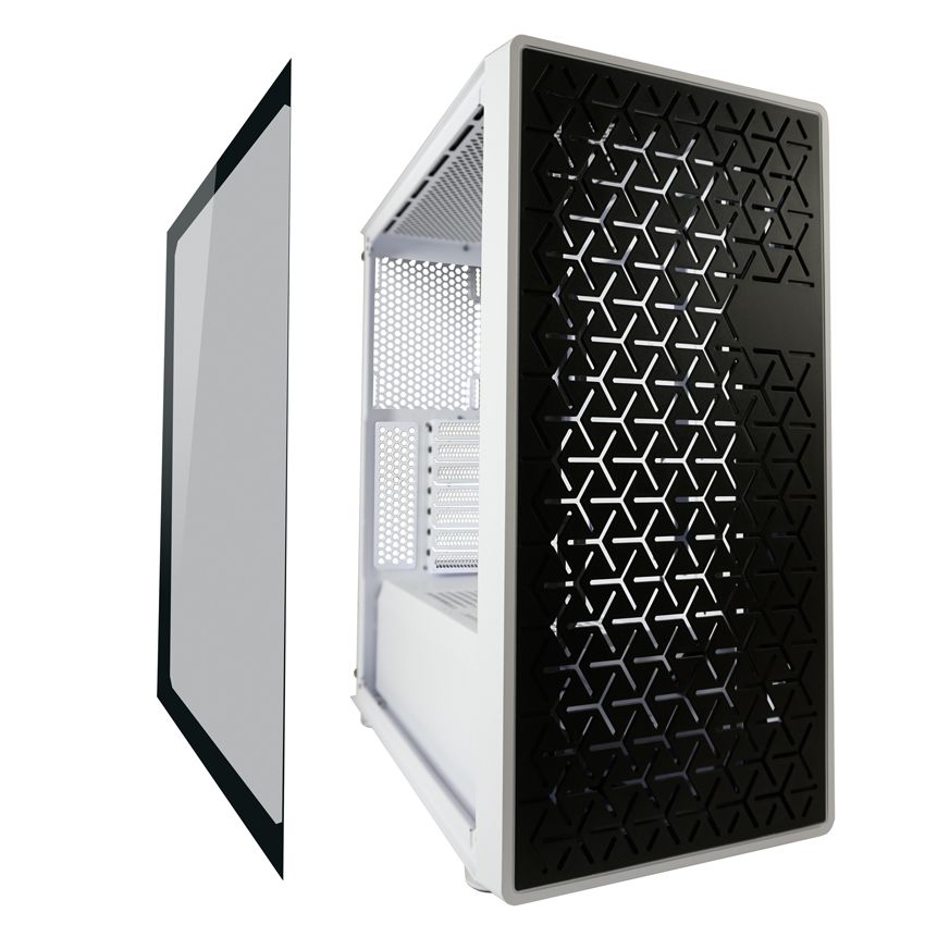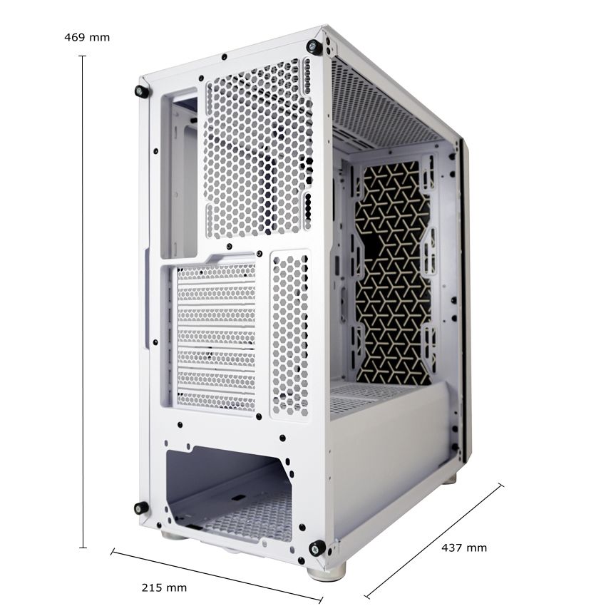 ATX, White/Black, 2x3,5", 4x2,5", 2xUSB2.0, 1xUSB3.2, Audio, Táp nélkül, 469x215x437mm, Tempered glass window, Gamer