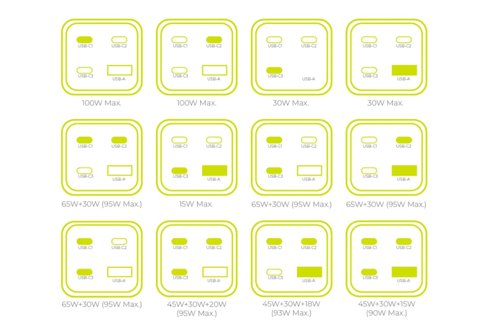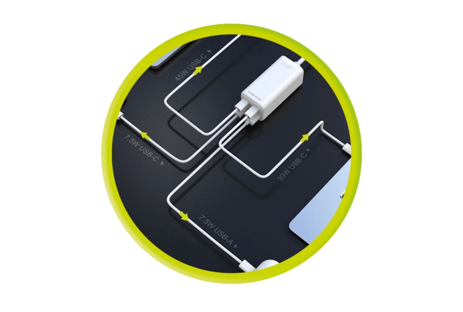 A 3× USB-C és 1× USB-A csatlakozóval egyszerre tölthet laptopot (45 W), táblagépet (30 W), okostelefont (7,5 W) és fejhallgatót (7,5 W) - gyorsan, hatékonyan és kompromisszumok nélkül.