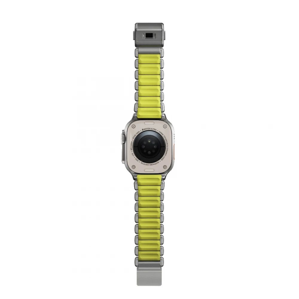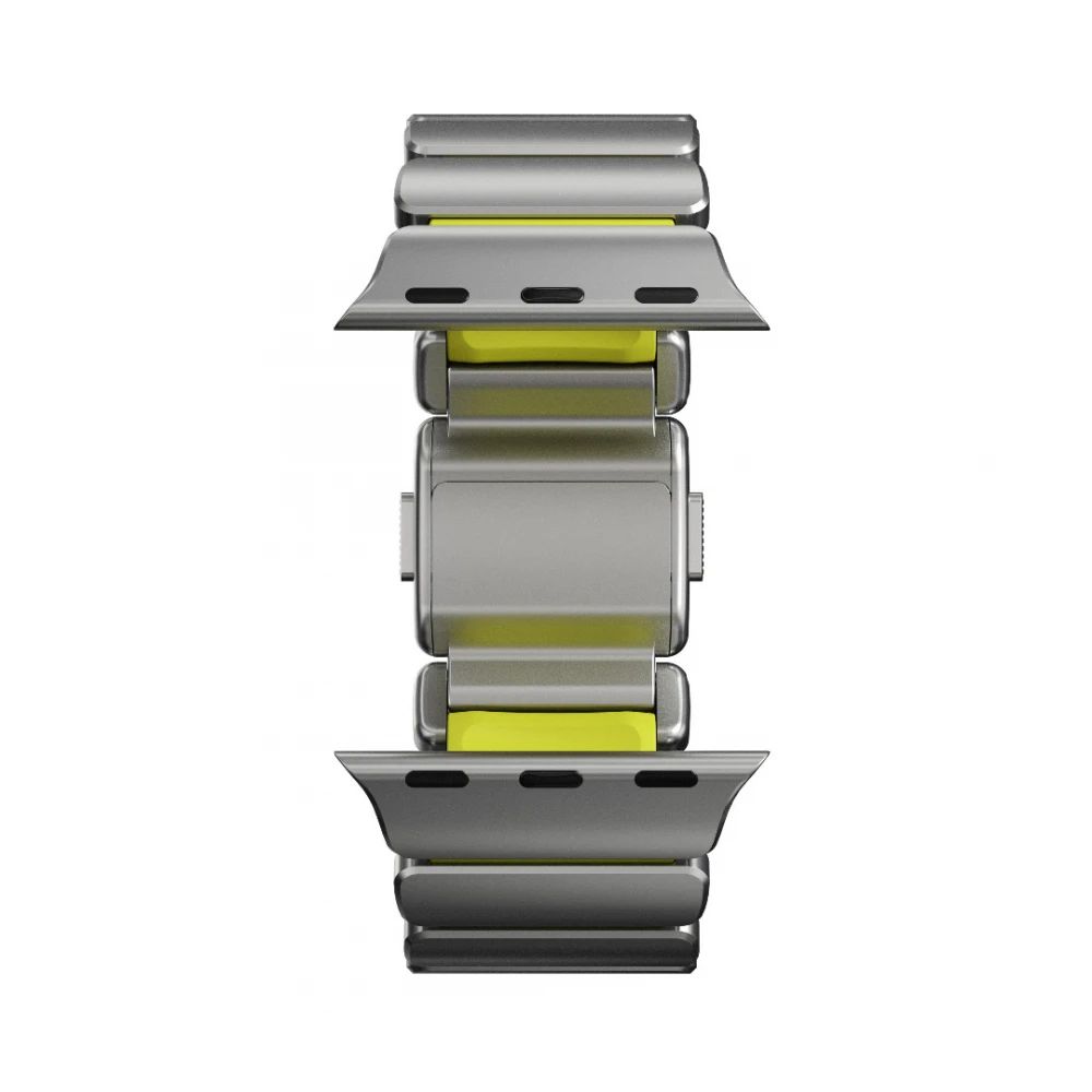 A külső titán láncszemek erősséget, szerkezetet és kifinomult ipari megjelenést kölcsönöznek a karkötőnek, míg a belső FKM láncszemek vízálló tartósságot, rugalmasságot és egész napos kényelmet biztosítanak. Az FKM mag a titán résein keresztül látható, ami a karkötőnek jellegzetes hibrid megjelenést kölcsönöz, amely inkább felszerelésnek tűnik, mint kiegészítőnek.