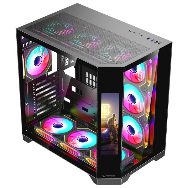 ATX, Black, 2x3,5", 3x2,5", 1xUSB2.0, 1xUSB3.0, Audio, Táp nélkül, 435x418x280mm, Ventilátor:7x12cm, Tempered glass window, RGB, Gamer
