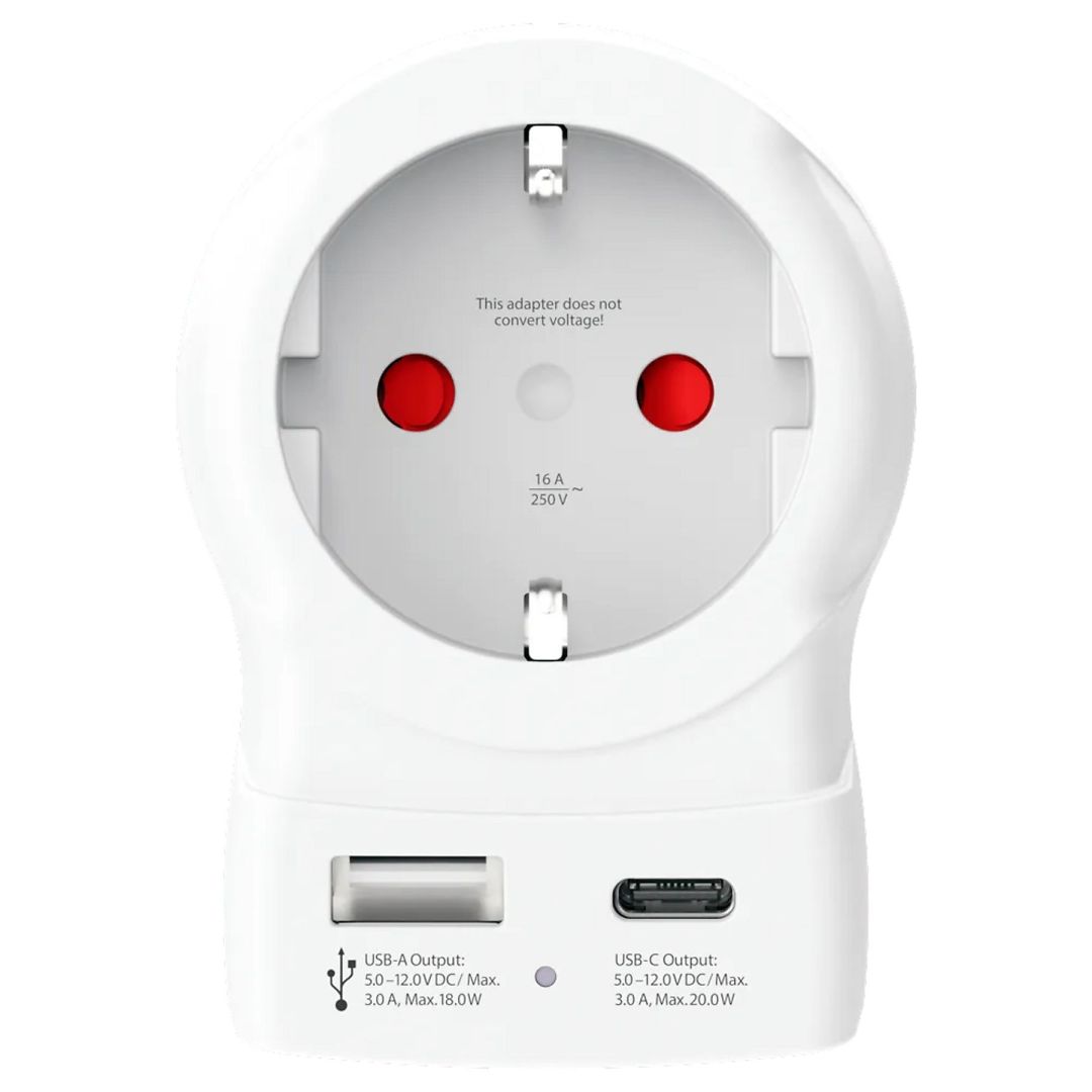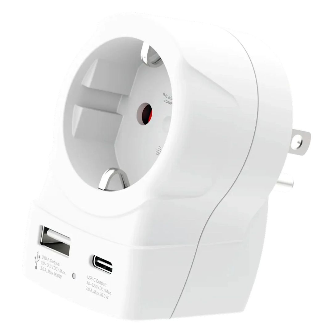 A SKROSS® Europe to USA USB megbízható és egyszerű megoldást nyújt, ha Schuko vagy Euro csatlakozós európai eszközeit az amerikai szabványú (USA) aljzatokhoz szeretné csatlakoztatni. Biztonságosan támogatja még a nagy teljesítményű készülékeket is, például laptopokat és hajszárítókat, miközben lehetővé teszi két USB-eszköz egyidejű töltését (USB-A + USB-C). Kompakt, praktikus megoldás, ha az Egyesült Államokba vagy bármelyik másik, USA-szabványt alkalmazó országba utazik.