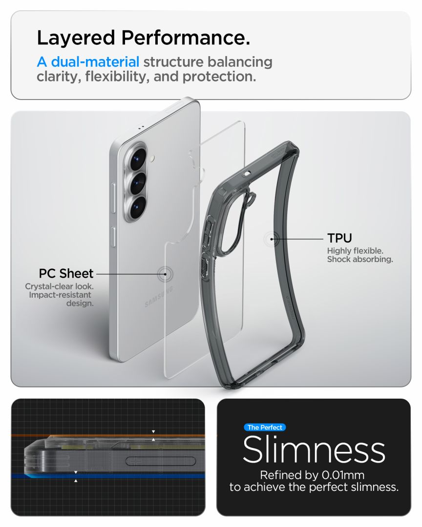 Védje stílusos telefonját a kopástól és az olajos ujjlenyomatoktól egy láthatóan elegáns módon. A Spigen Ultra Hybrid hibrid sorozat érett és rendkívül látványos „Space Crystal” megjelenése lehetővé teszi, hogy Samsung Galaxy S26 készülékét egy átlátszó, sötét füstszűrőn keresztül lássa, amely radikálisan megakadályozza a nyomok megjelenését az eredeti sötét burkolaton.