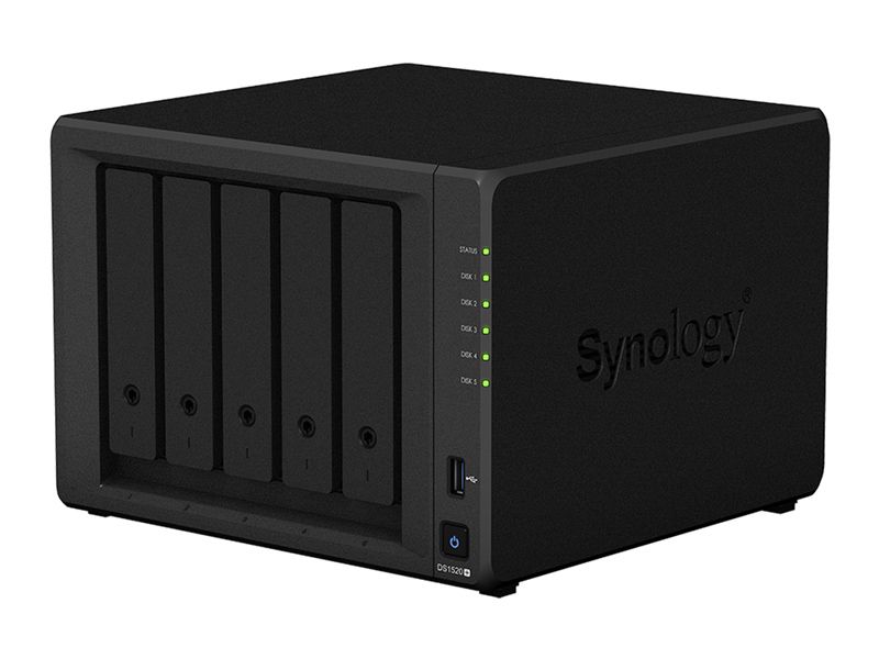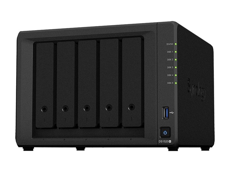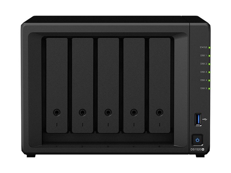 A DS1520+ processzora (Intel Celeron J4125, 4×2–2,7 GHz) a DS720+-ban mutatkozott be a Synology kínálatában, és már több modell is épült köré. Itt 8 GB (2×4 GB) RAM-al kapjuk előtelepítve mely egyúttal az elérhető maximum is. H.265, H.265, MPEG2 és VC-1 kódolású videókat is képes hardveresen transzkódolni, akár 4K/30fps felbontásig, képsebességig. A hátlapon immár 4 darab gigabites RJ45-ös ethernet-csatlakozót, 2 darab eSATA-portot (pl. a DX517-es bővítőegységek számára) és 1 darab USB3.0-t találunk. Az előlapon még 1 USB3.0-port kapott helyett, összesen tehát 2 használható USB-s perifériák számára. A készülék alján – akár csak a DS920+ esetében is – nyitható fedél alatt két darab M.2 SSD foglalatot találunk 2280 NVMe SSD-k számára, amelyek cache-ként használhatóak a lemezműveletekhez. Belső kártyahely nincs a DS1520+-ban.