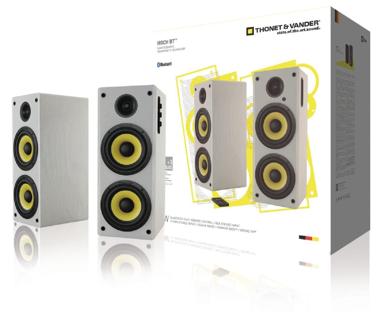 A legenda visszatért, jobb, mint valaha. Tapasztalja meg az audio kiválóság csúcspontját a Hoch, Thonet & Vander ikonikus, dupla sárga hangszóróival, amelyek fehér és fekete színben kaphatók. Az új Hoch tiszta, pontos hangzást biztosít a DSP (digitális jelfeldolgozás) segítségével, amely páratlan hangzást biztosít, és a készüléken található digitális hangerő-, magas- és mélyhang-egyenlítővel testreszabható. Túlmutat a puszta hallgatási élményen, függetlenül attól, hogy zenét hallgat, filmesteket rendez, tökéletesíti játékélményét vagy finomhangolja audiovizuális prezentációit. A távirányító egyszerűségével a Hoch bármilyen teret hifi hangzású központtá alakít, zökkenőmentes csatlakozási lehetőségekkel, beleértve a Bluetooth, S/PDIF (optikai) és RCA sztereó csatlakozókat. Hangművészeti nyilatkozat minden szobában.