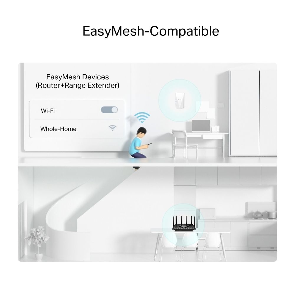 EasyMesh-kompatibilis: Rugalmasan hozhat létre hálózati rendszert az EasyMesh-kompatibilis útválasztóval való összekapcsolással, így zökkenőmentes lefedettséget biztosítva az egész otthonban.