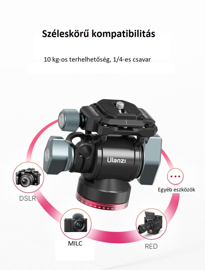 1/4 hüvelykes csavaros csatlakozási kialakítás, 10 kg terhelhetőséget támogat, az állványfej kompatibilis a tükörreflexes fényképezőgépekkel, tükör nélküli kamerákkal, sportkamerákkal stb. <br><br>