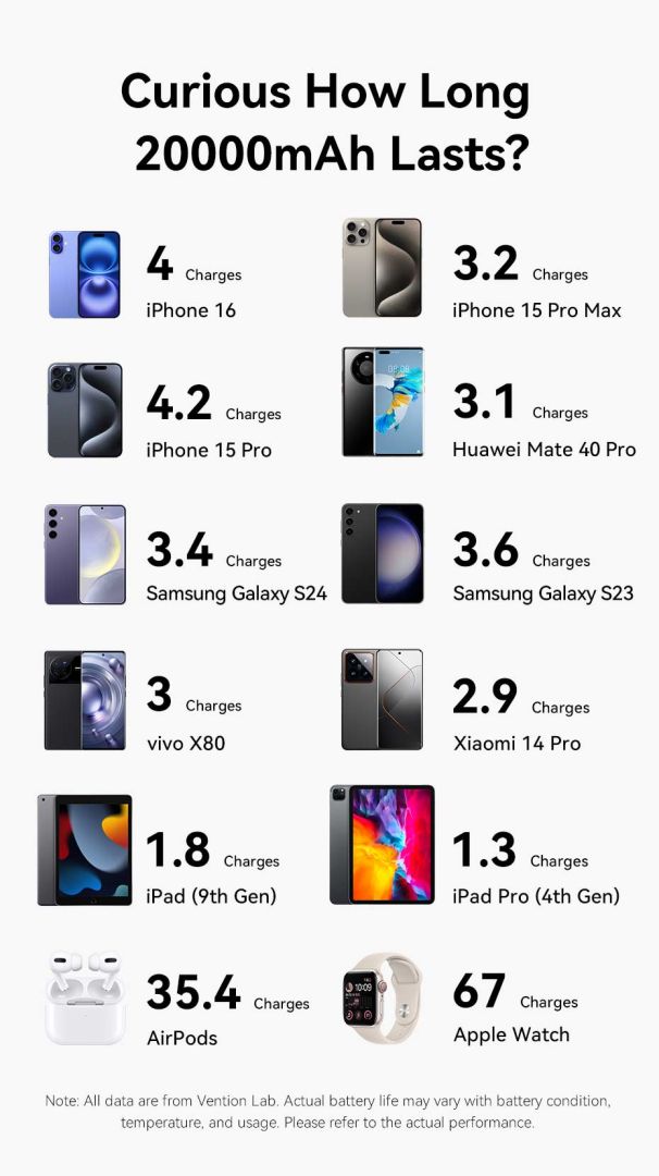 20,000mAh a gondtalan utazásért - A 20,000 mAh nagyteljesítményű akkumulátorral ez a power bank kb. 1,3-szor tölti fel a MacBook Air 13-at vagy akár 4-szer az iPhone 16-ot. Tökéletes üzleti utazásokhoz, ingázáshoz vagy szabadtéri tevékenységekhez - maradjon gondozott. Még 1000 töltési ciklus után is 80% feletti marad az akkumulátor állapota, Tartalmaz egy flanel tároló tasakot, amely védőtokként szolgál, és könnyen hordozható