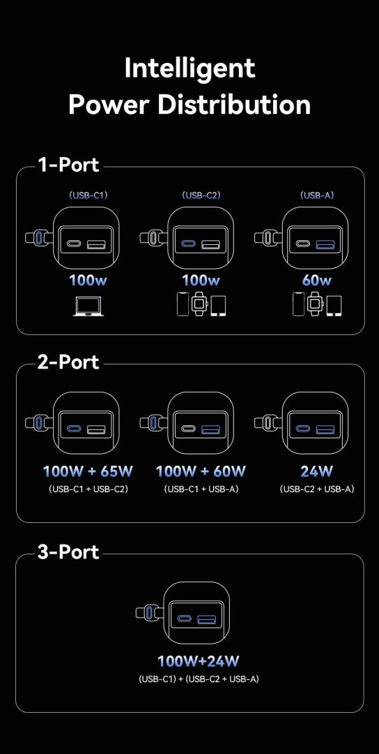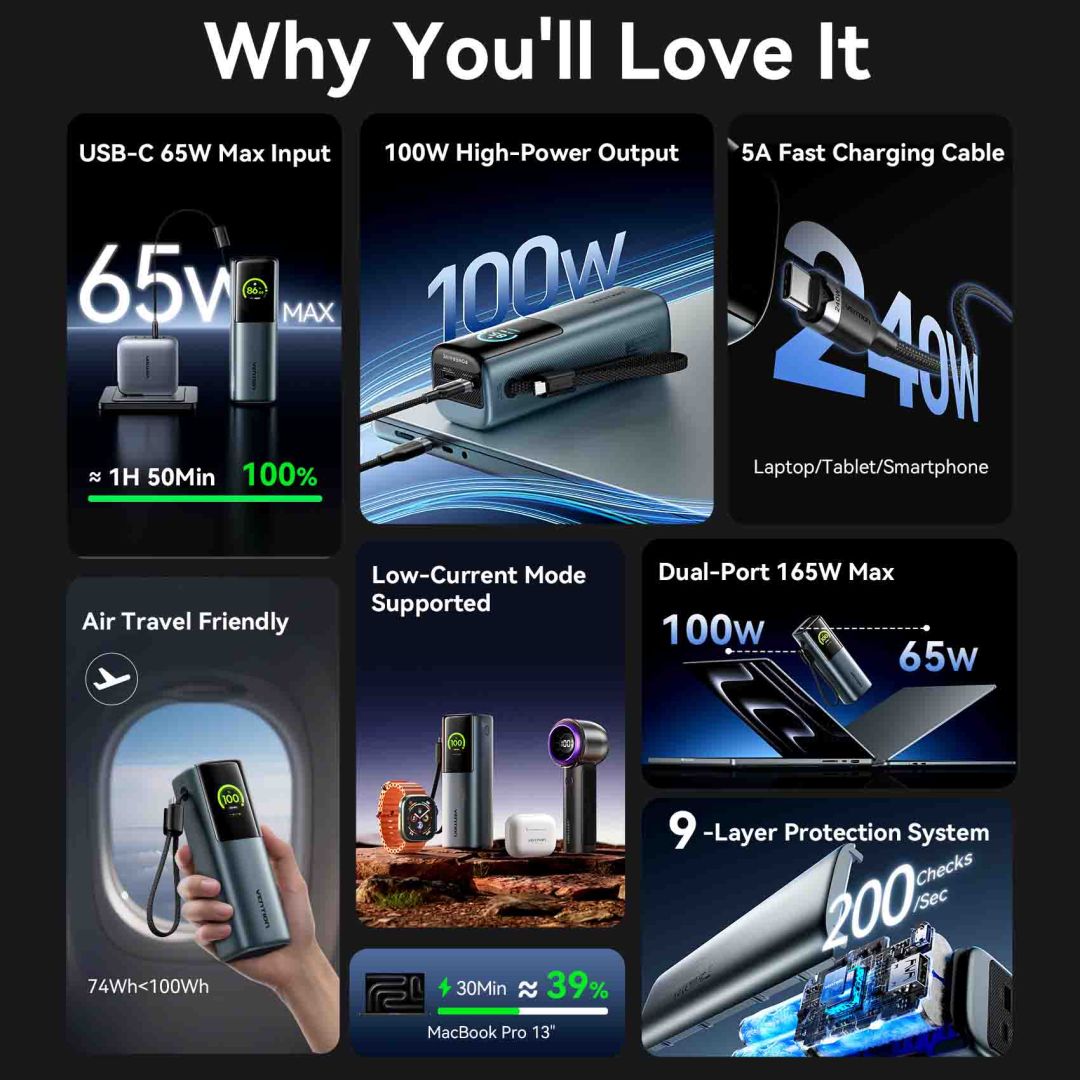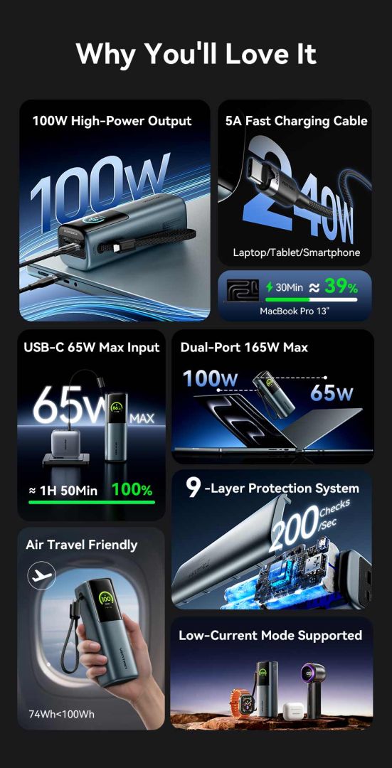 All-in-One univerzális gyorstöltési megoldás- Gyorstöltés Galaxy S25 Ultra 45W, iPhone 16 Pro, iPad Pro & 99.9%-a 100W alatti eszközöknek, és az USB-C1, USB-C2 és USB-A egyszerre tölti a laptopot, okostelefont és fejhallgatót - nincs várakozási idő, nincs szükség több töltőre ezzel az USB C power bankkal ( Ha harmadik féltől származó kábelt használ, kérjük, használjon olyan kompatibilis harmadik féltől származó kábelt, amely támogatja az 5A áramot és a 100W teljesítmény leadását)